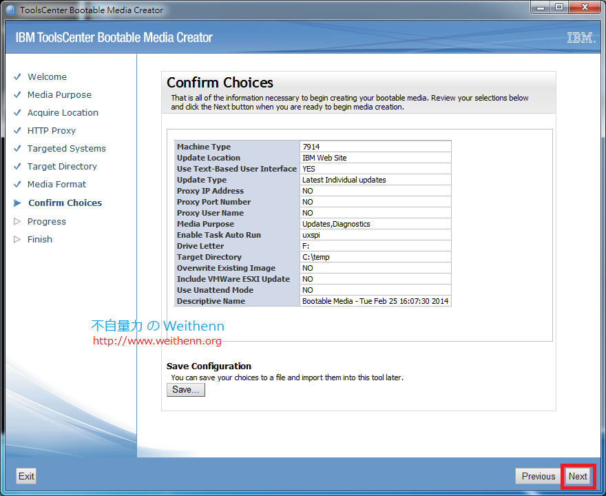 10. 在 Confirm Choices 頁面中,將剛才所互動設定的資訊列表讓您再確定一次,您可以按下 「Save」鈕將設定存檔,以便後續有同樣需求時可直接使用。